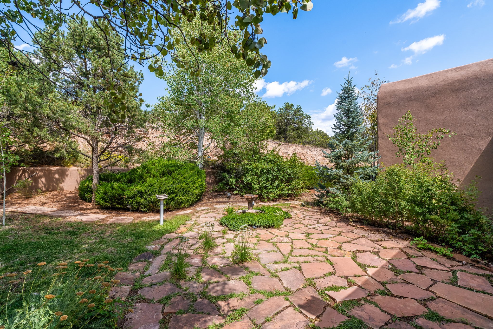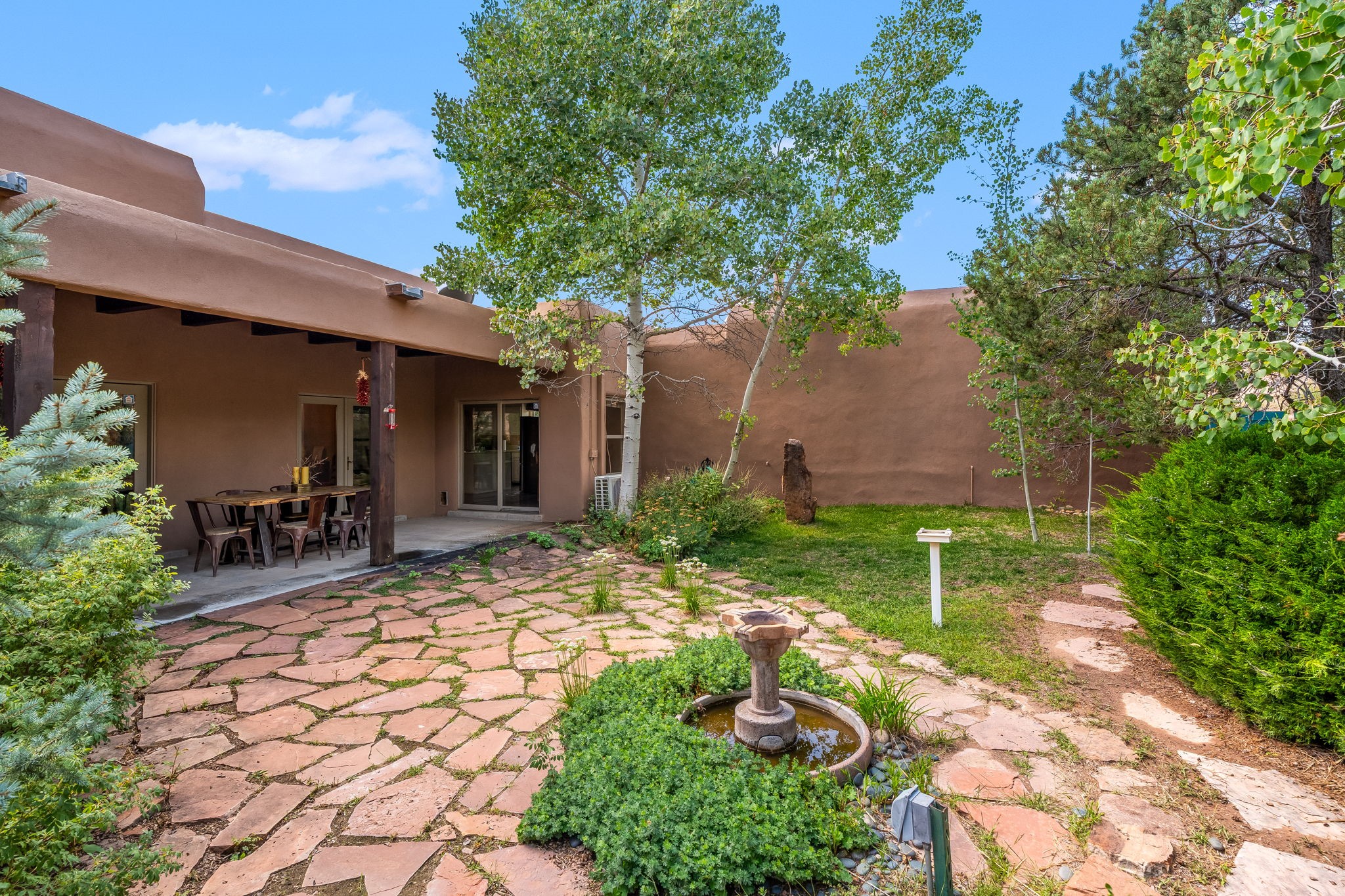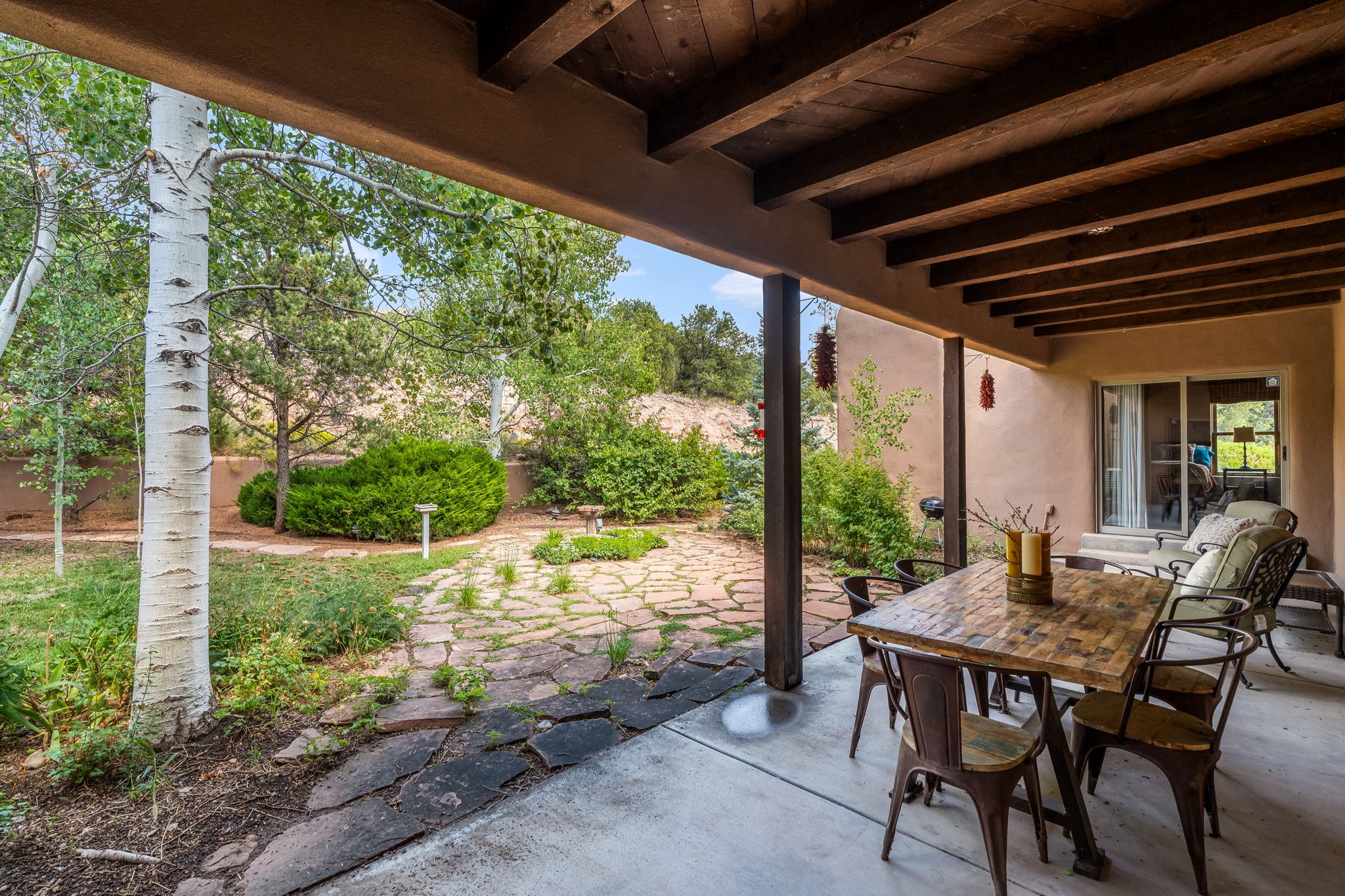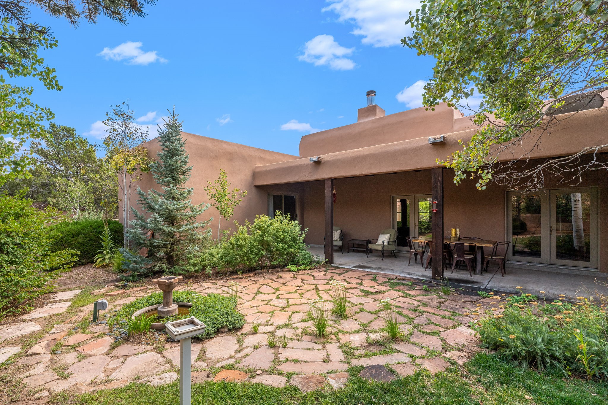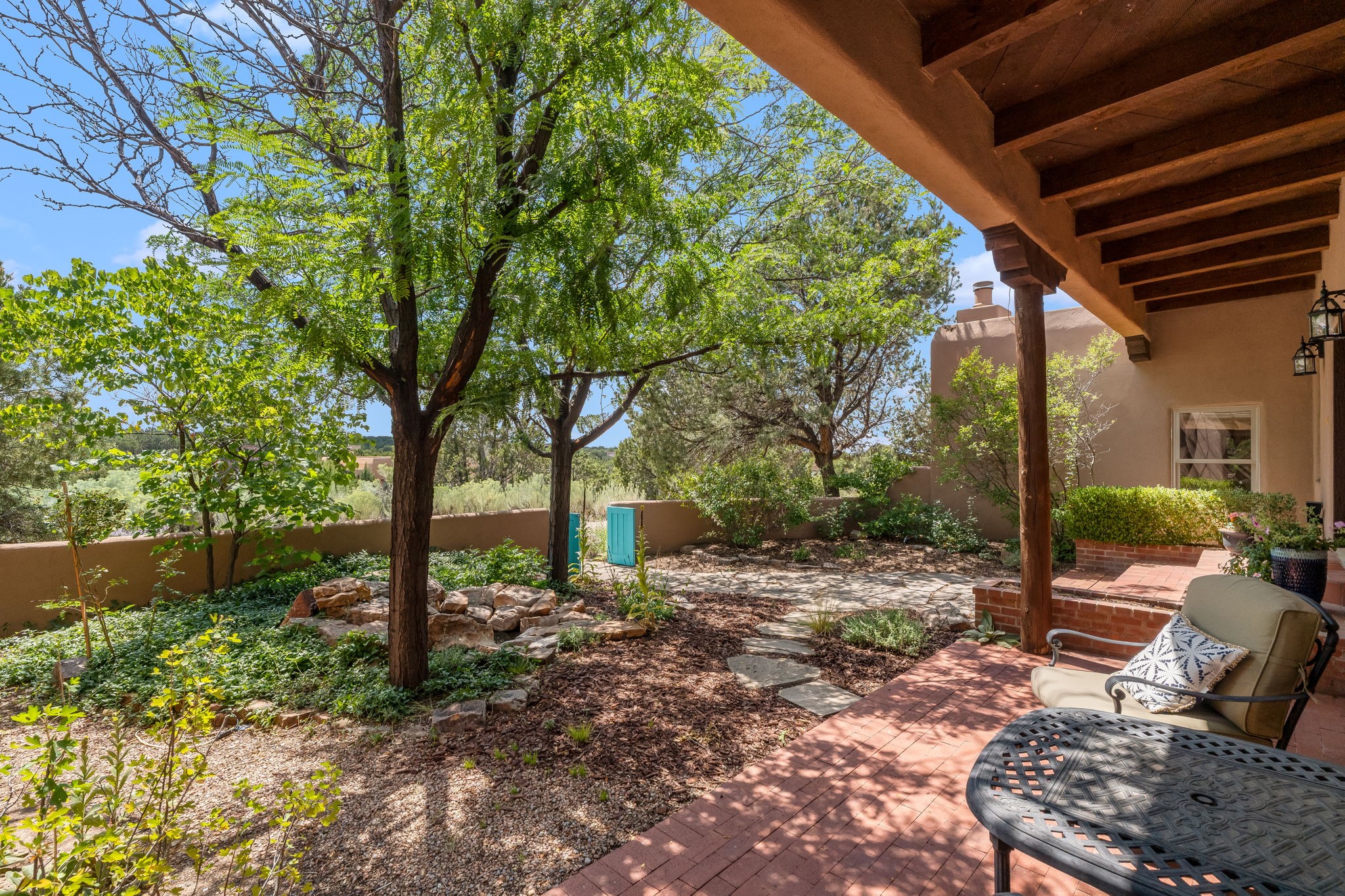 Experience timeless Southwest style in this exceptional La Mariposa home. Natural light highlights beamed ceilings, Saltillo tile, custom wood doors and hand-plastered walls. The spacious living room with a wood-burning fireplace flows seamlessly to multiple outdoor patios--perfect for entertaining or relaxing. The kitchen offers generous storage and a large walk-in pantry. A luxurious primary suite features a spa-like bath with dual sinks, soaking tub, and glass shower. A guest suite with en suite bath, plus an office with fireplace offers flexible living. Just 15 minutes to downtown Santa Fe's shopping, dining, and cultural attractions.