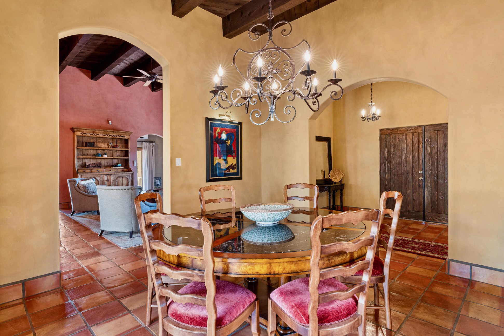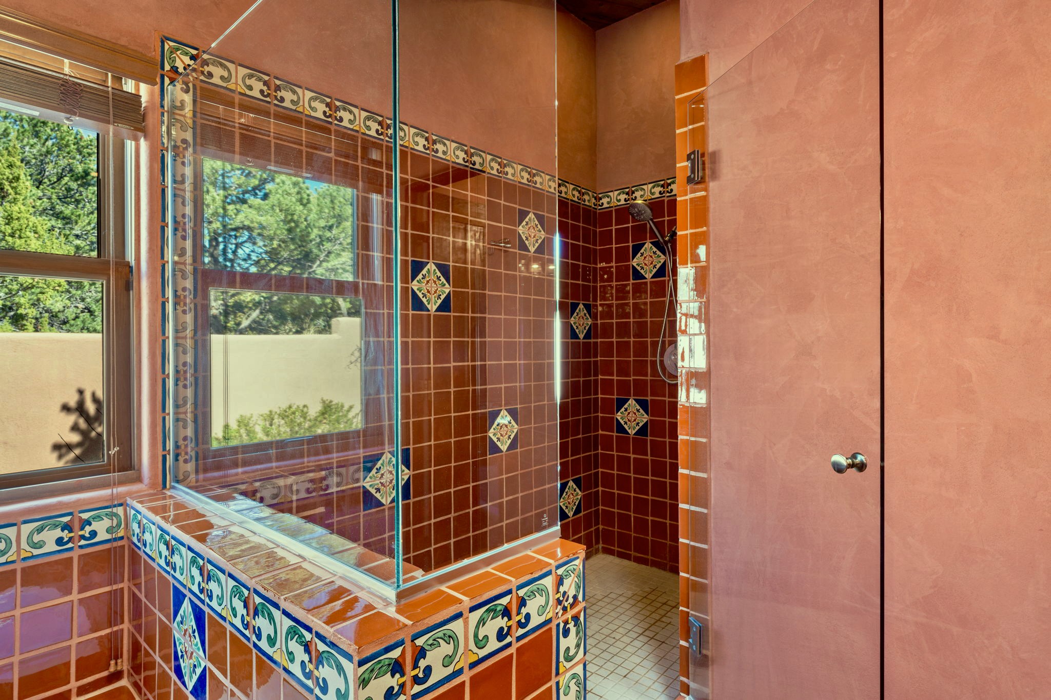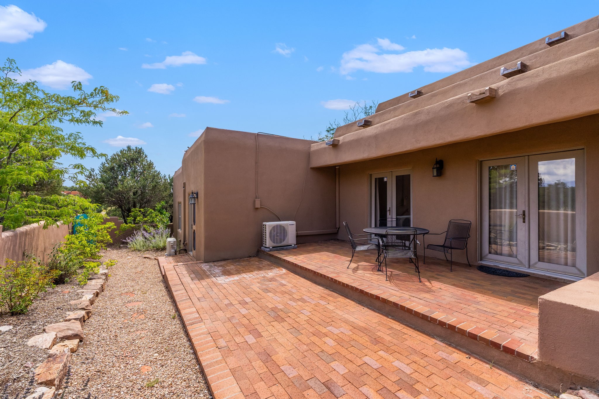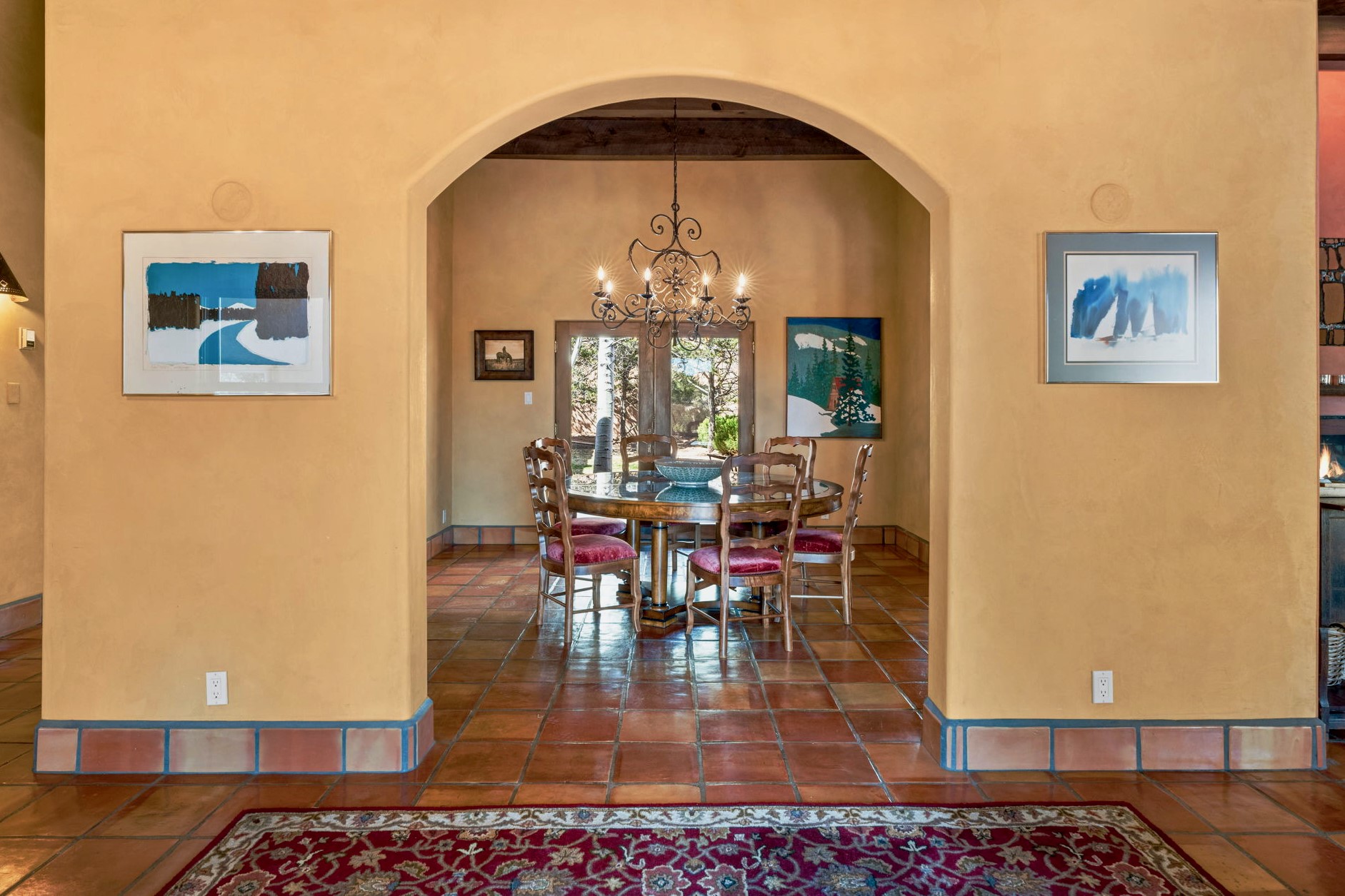 Experience timeless Southwest style in this exceptional La Mariposa home. Natural light highlights beamed ceilings, Saltillo tile, custom wood doors and hand-plastered walls. The spacious living room with a wood-burning fireplace flows seamlessly to multiple outdoor patios--perfect for entertaining or relaxing. The kitchen offers generous storage and a large walk-in pantry. A luxurious primary suite features a spa-like bath with dual sinks, soaking tub, and glass shower. A guest suite with en suite bath, plus an office with fireplace offers flexible living. Just 15 minutes to downtown Santa Fe's shopping, dining, and cultural attractions.