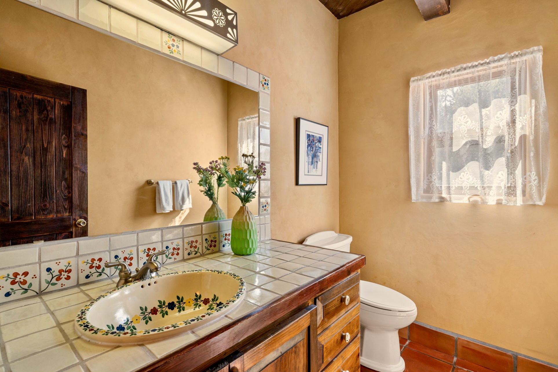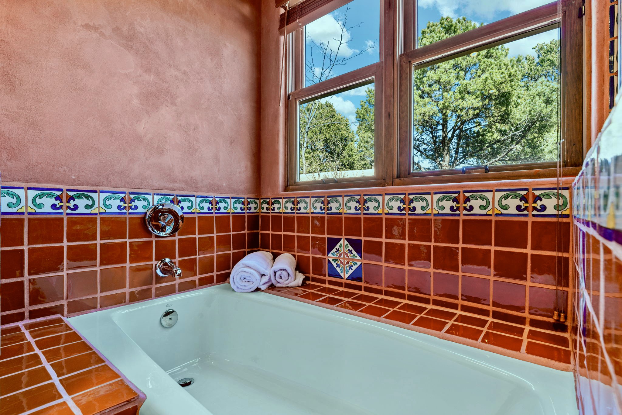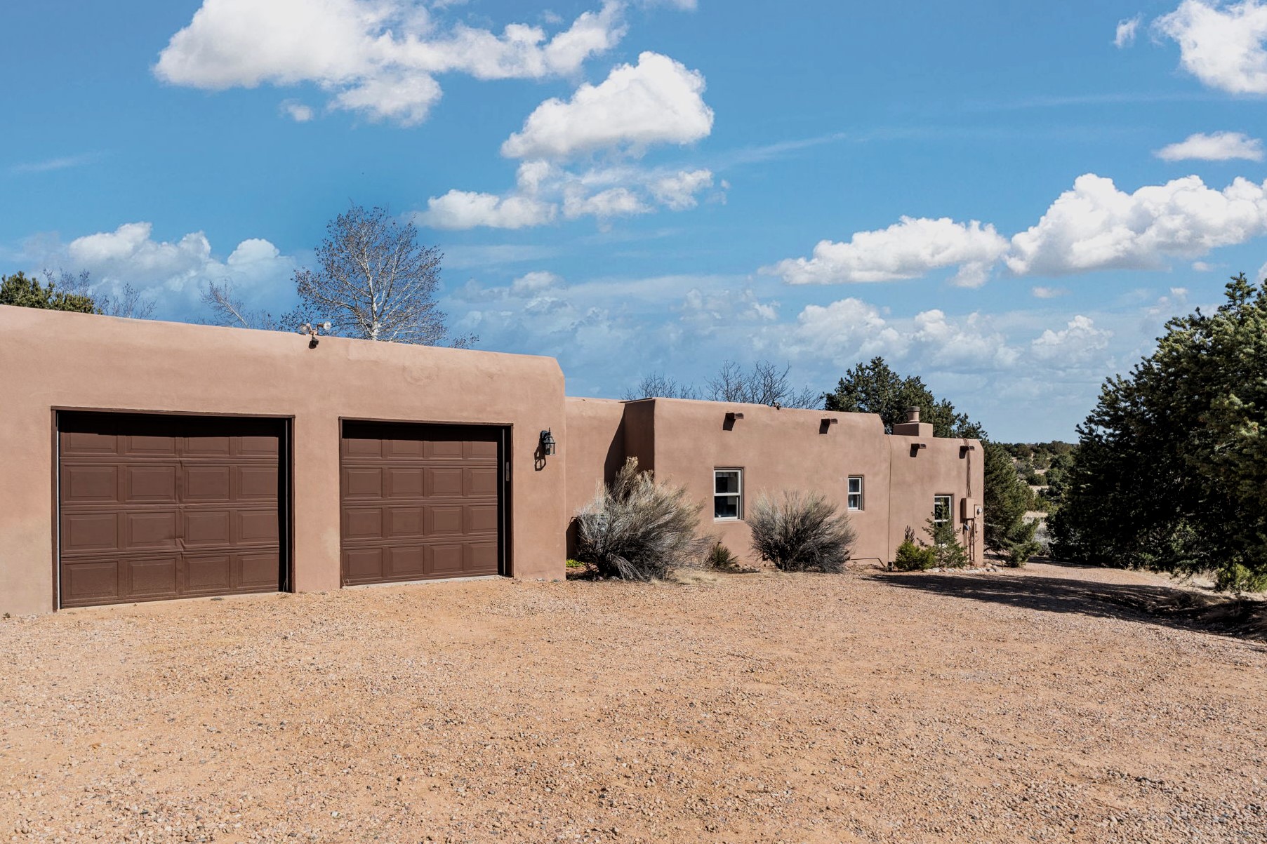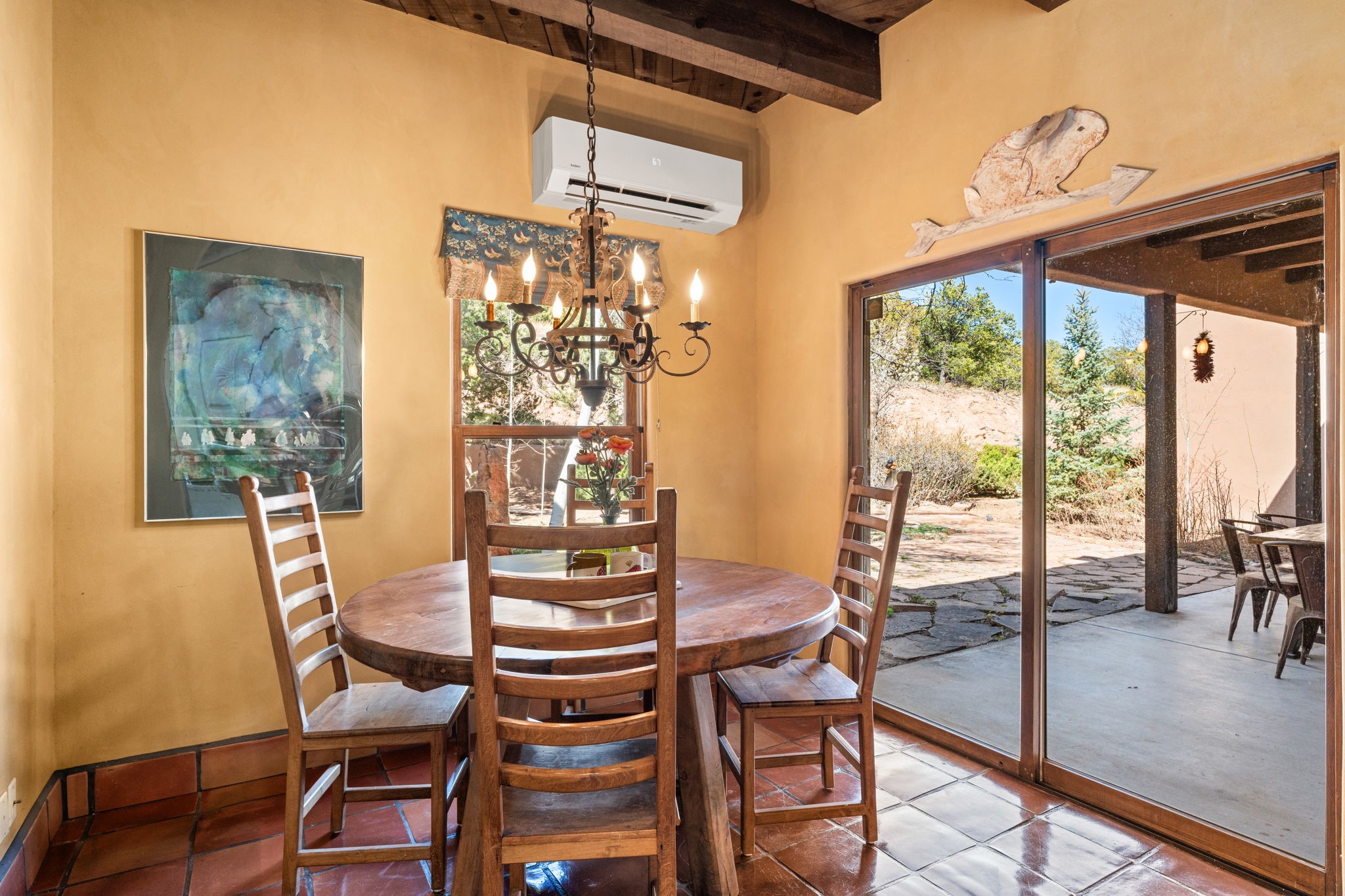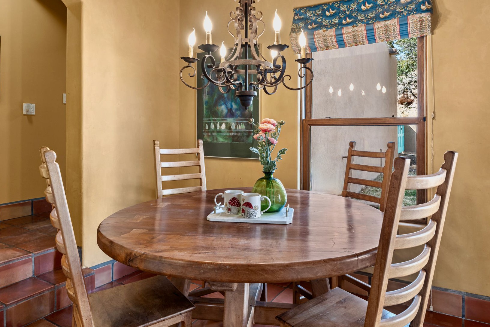 Experience timeless Southwest style in this exceptional La Mariposa home. Natural light highlights beamed ceilings, Saltillo tile, custom wood doors and hand-plastered walls. The spacious living room with a wood-burning fireplace flows seamlessly to multiple outdoor patios--perfect for entertaining or relaxing. The kitchen offers generous storage and a large walk-in pantry. A luxurious primary suite features a spa-like bath with dual sinks, soaking tub, and glass shower. A guest suite with en suite bath, plus an office with fireplace offers flexible living. Just 15 minutes to downtown Santa Fe's shopping, dining, and cultural attractions.